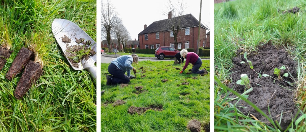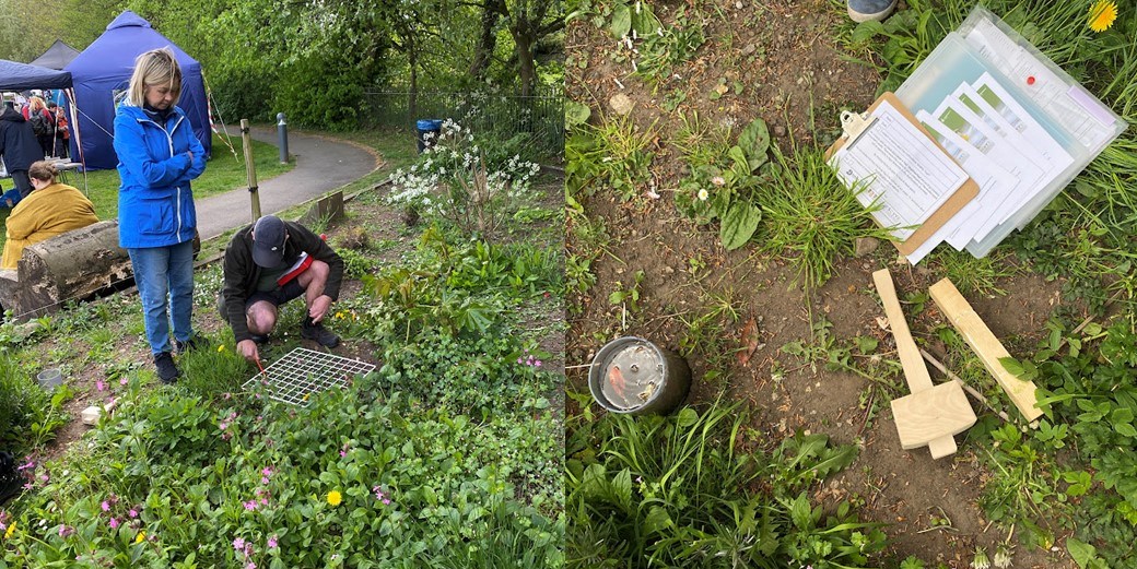 The Nature in Your Neighbourhood project moved into its second year in April; Moorlands Climate Action volunteers got their hands dirty and started sampling on site – and they loved it! After a year of preparation and publicising the project, there was a real feel of beginning to do what our members love best – improving nature in their neighbourhood. For a very few volunteers it meant brushing up on old skills. “I haven’t handled a quadrat for years and it was nice to get back to something I really enjoyed doing,” said one. “Particularly as I was doing it on land I pass often, just round the corner from my house!”